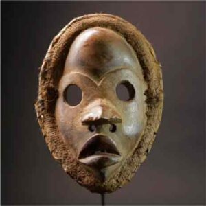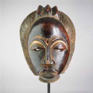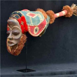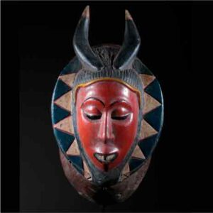 Ce masque facial en bois peint de pigments naturels représente la tête d’une antilope. Il arbore deux grandes cornes qui se joignent au sommet formant un grand U. La base des cornes est entaillée et fait référence aux stries ondulés des cornes des antilopes. Son visage est allongé et comporte des yeux mis clos. Le nez est peu prononcé et la gueule est béante. Le masque Sévi appartient à la confrérie sacrée des Gyè, haute institution qui est la plus puissante des formes de masques. Il sort généralement de la forêt sacrée pendant les cérémonies funéraires. Il sert également à intimider les hommes en établissant la justice et le droit.