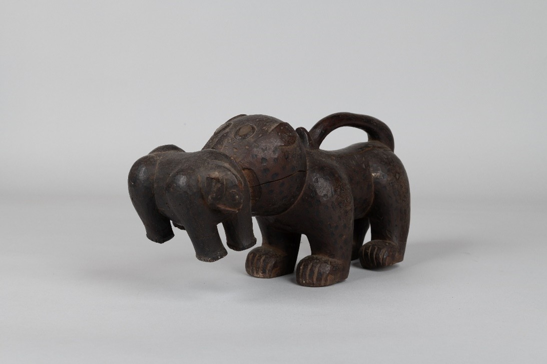 Cette statuette polychrome en bois est la représentation d’un félin mâle (panthère) tenant sa proie dans sa gueule. Les entailles peintes en noir dans le bois font référence aux tâches de son pelage. L’animal court sur pattes et trapu, a les yeux écarquillés en verres, les oreilles plaqués le long de la tête, la queue courbée le long du dos. Dans la statuaire cérémonielle baoulé, la Panthère s’associe aux emblèmes conventionnels du pouvoir de la chefferie politique, Ici il symbolise la puissance des chefs baoulé.